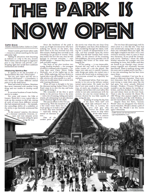 Despite these few flaws, “Jurassic World” does not disappoint this historic movie franchise. Would I attend a park of this sort? No. Would I see this movie again? Absolutely.